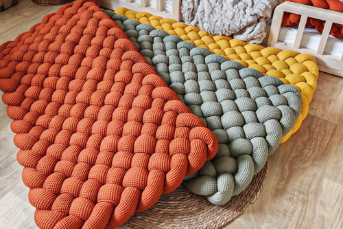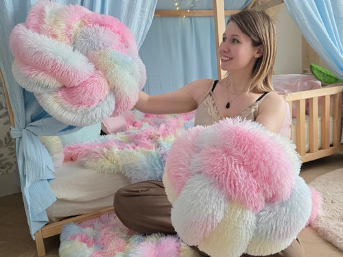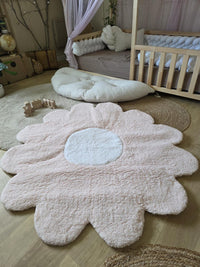 Le tapis marguerite de la précédente génération ! Je l'ai depuis revisité, ce sont ici les dernieres pièces. En moumoute et interieur rembourrage ouate.